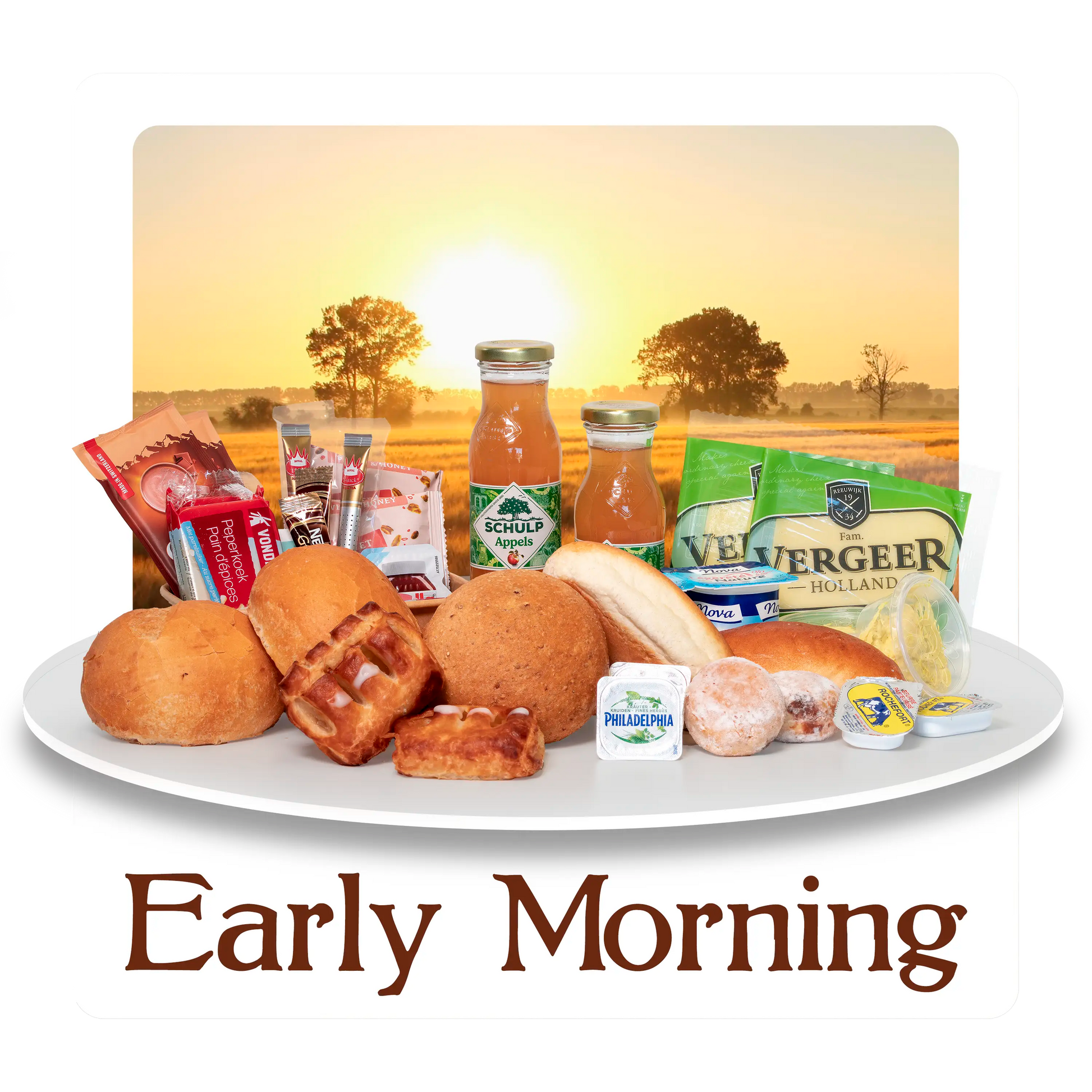 Kaas, Boursin, Kip curry, Boter, Confituur, Choco, Granola, Natuuryoghurt, Peperkoek.
